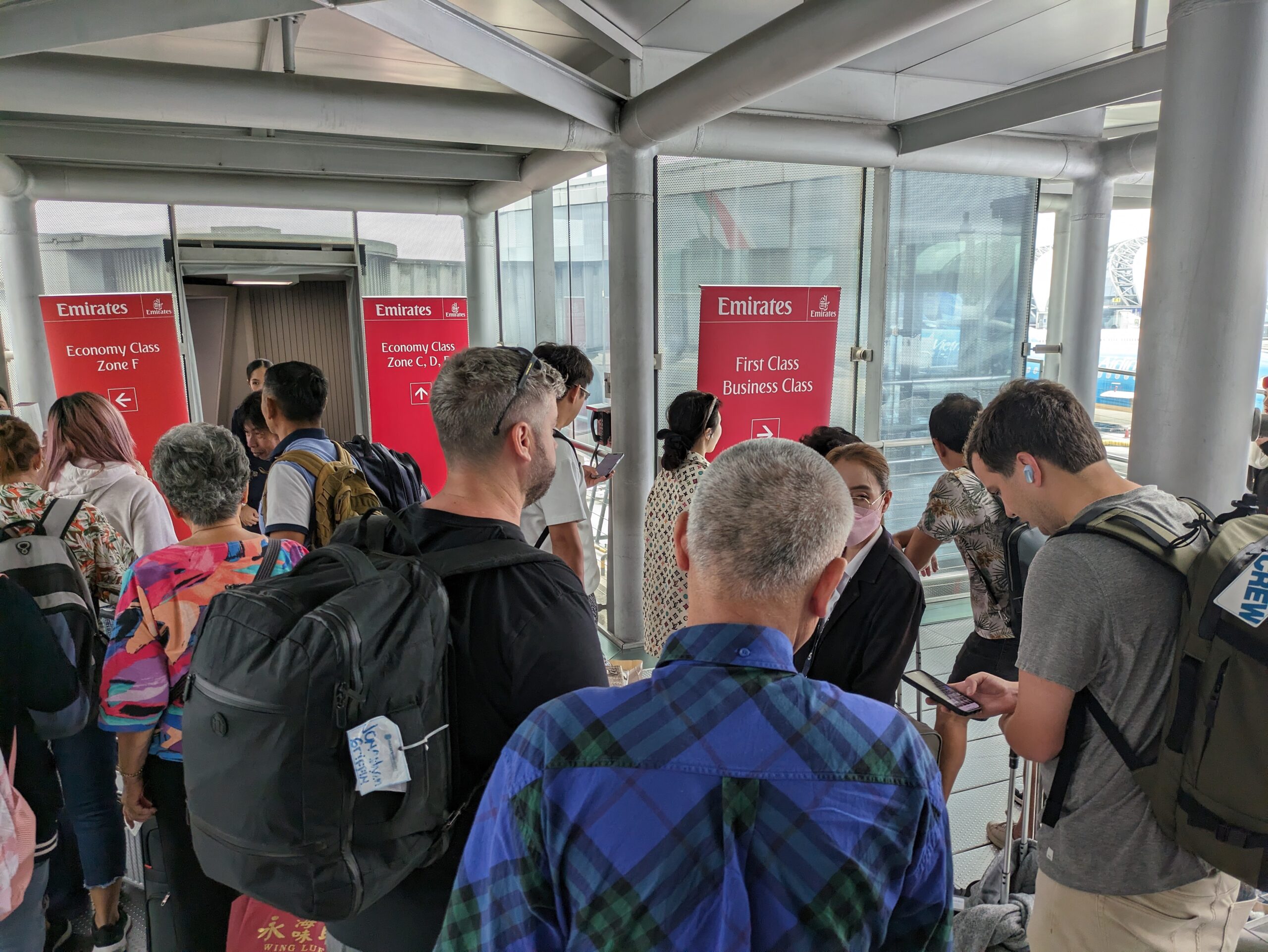 Het boarden verloopt rommelig. Er is wat vertraging, maar ook is de volgorde van de diverse boarding groepen onduidelijk. In de jetbridge is vervolgens een opstopping, wat het allemaal nog wat chaotischer maakt. Een groep mensen voor me vliegt vandaag in First Class. Eerlijk is eerlijk: dat zou ik nog liever hebben gevlogen vandaag 😉 . Helaas zijn alle 14 First Class stoelen bezet en zit een upgrade met Skywards Miles er niet in.