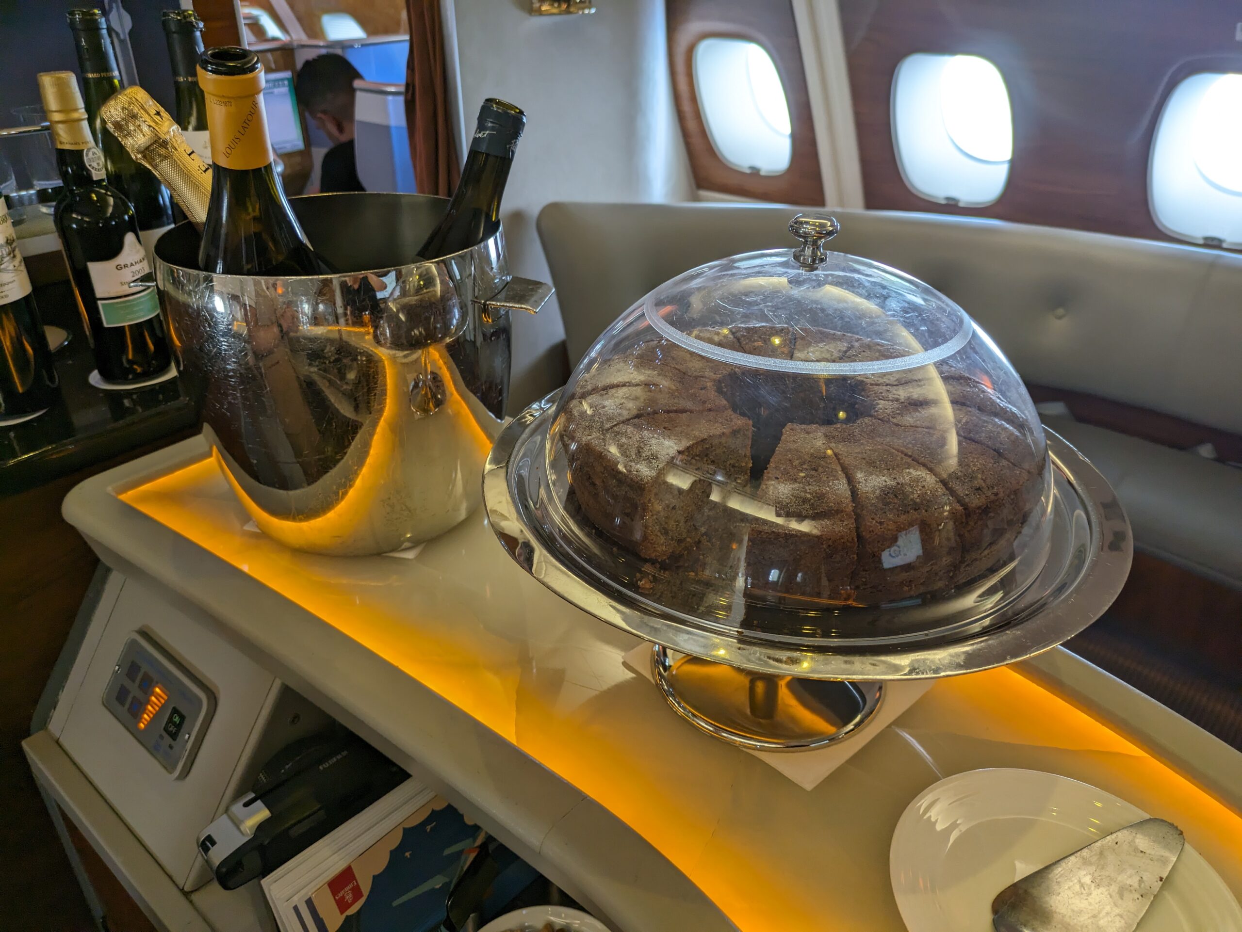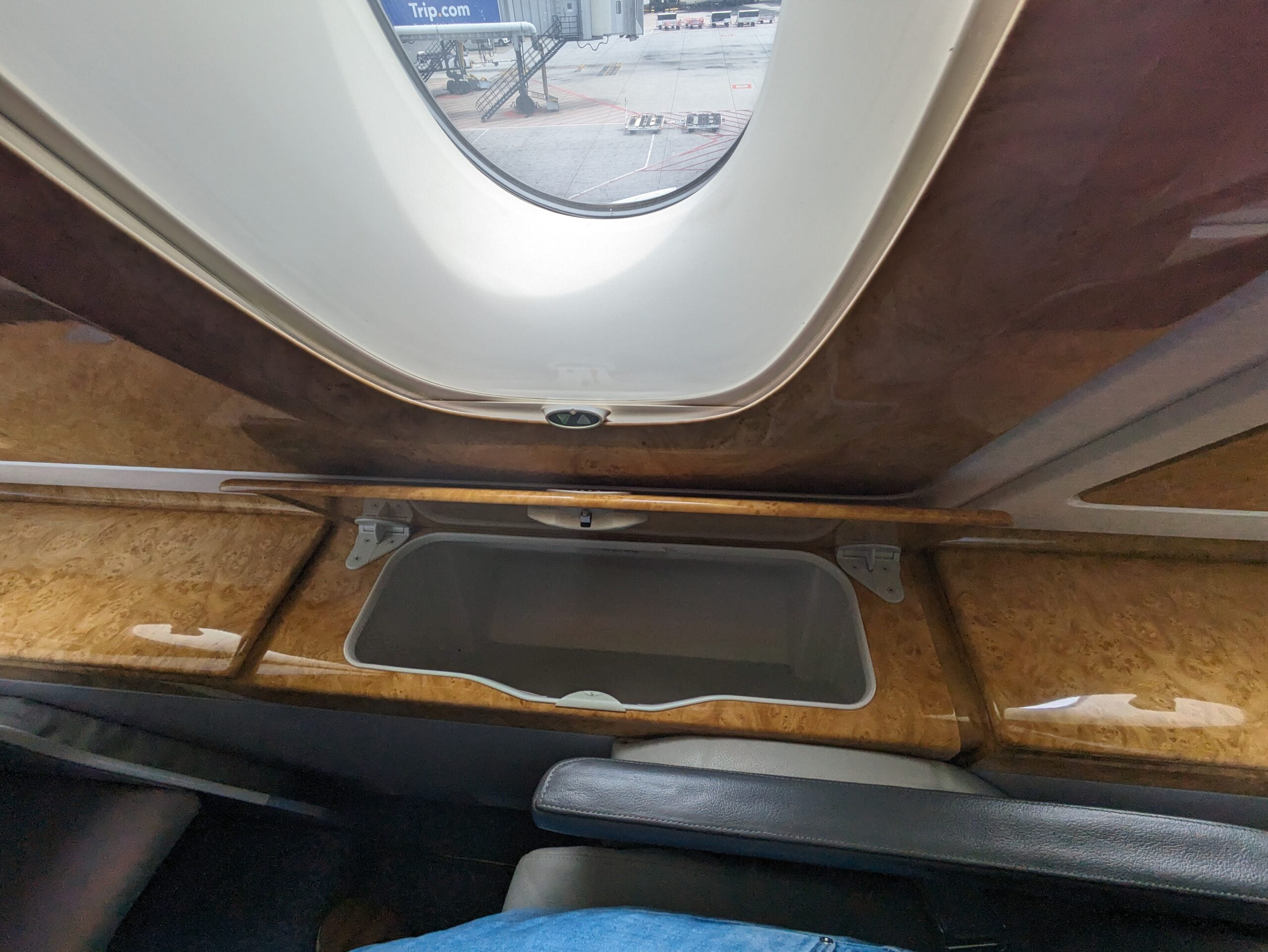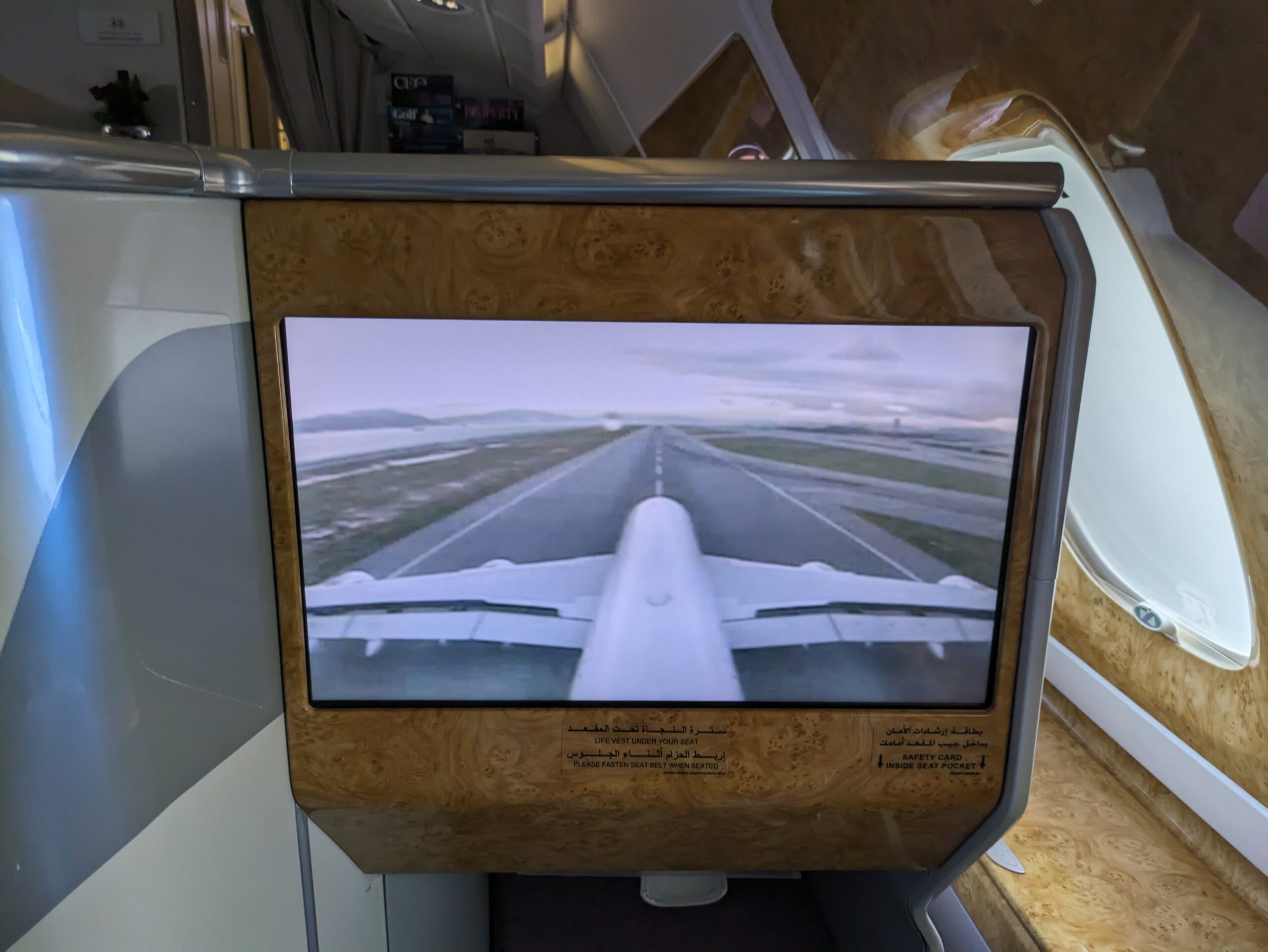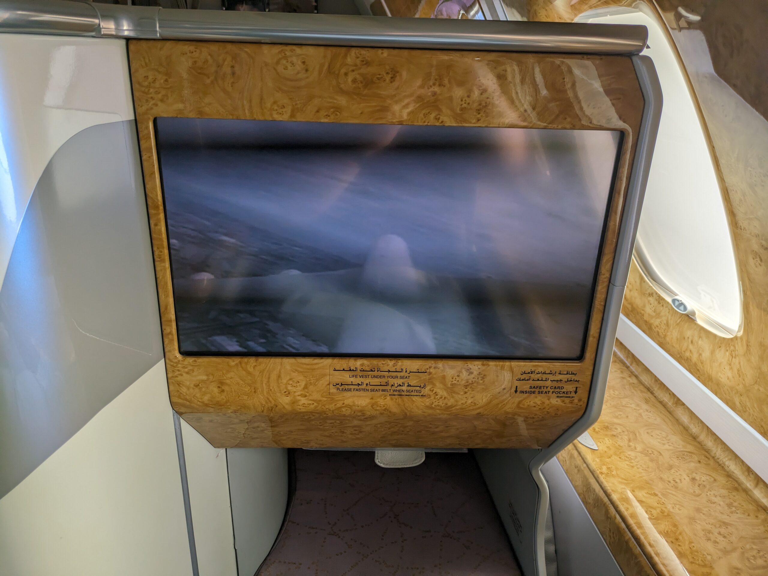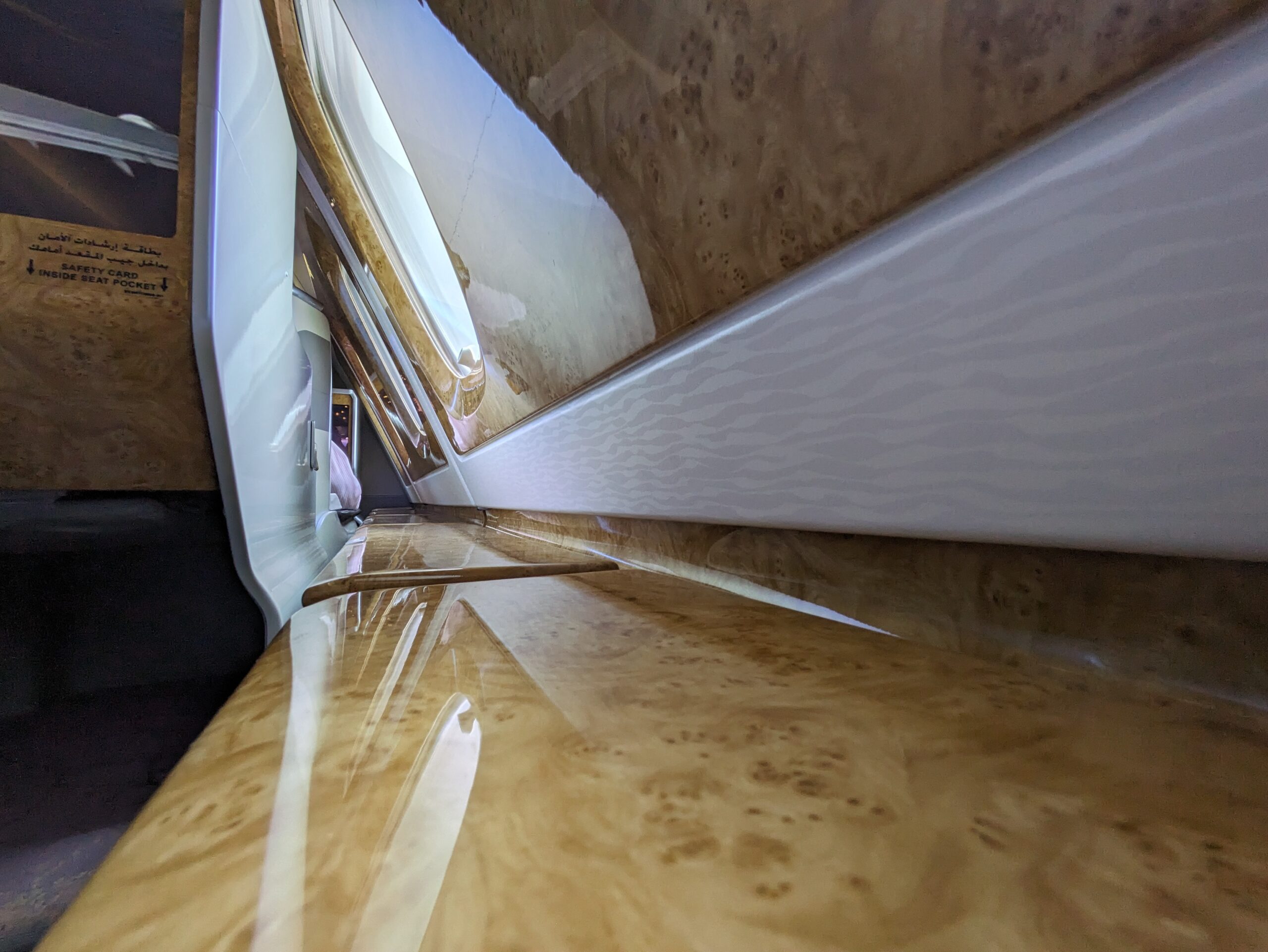 De cabine is heerlijk ruim, maar de gigantische hoeveelheid glimmend hout moet je maar net kunnen waarderen. Wat mij betreft is het allemaal een beetje overdreven, maar het past wel helemaal bij Emirates.