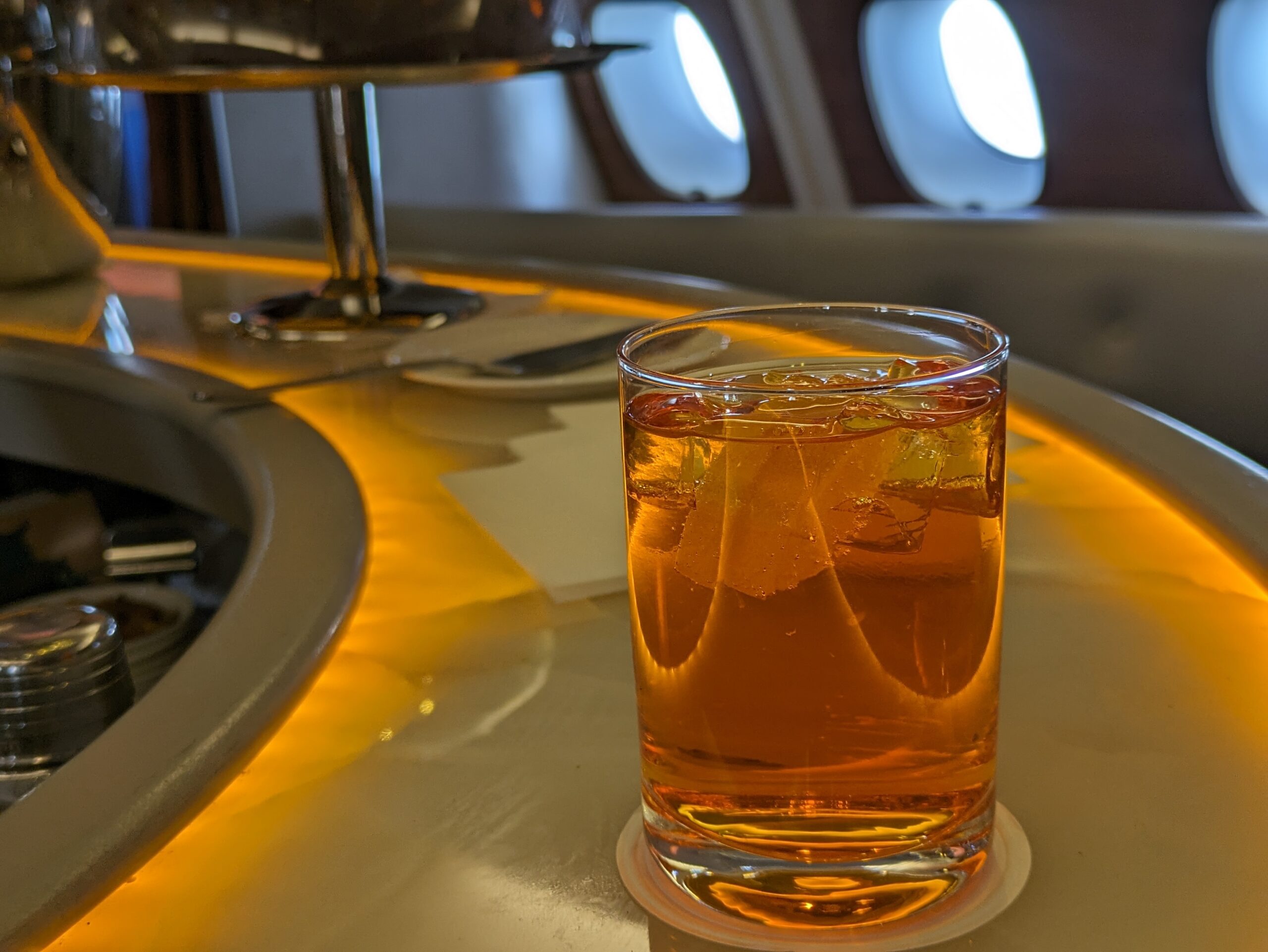 De strategie om zo ver mogelijk voorin de Business Class te gaan zitten heeft gewerkt: bijna iedereen is nog bezig met de maaltijd zodat ik de bar even rustig kan verkennen. Wat een geweldige toevoeging!