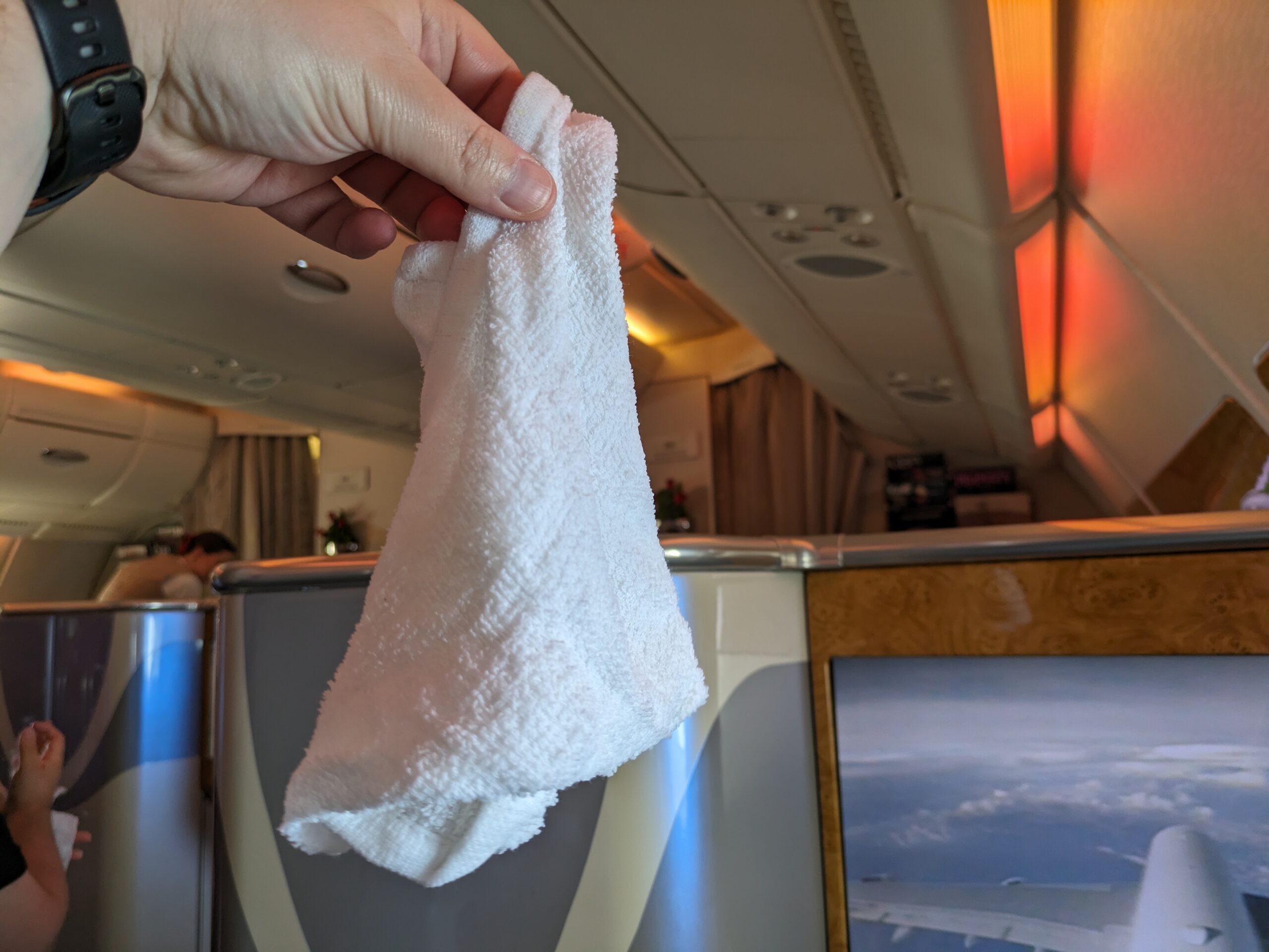 Tijd voor een welkomstdrankje! Ik kies voor een glas champagne. Emirates schenkt aan boord van deze fles Moët & Chandon Imperial Brut. Tevens krijg ik een verfrissingsdoekje.