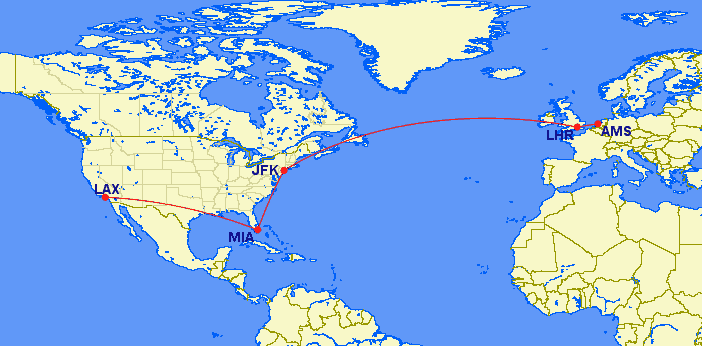 - Amsterdam – Londen – New York – Miami – Los Angeles.