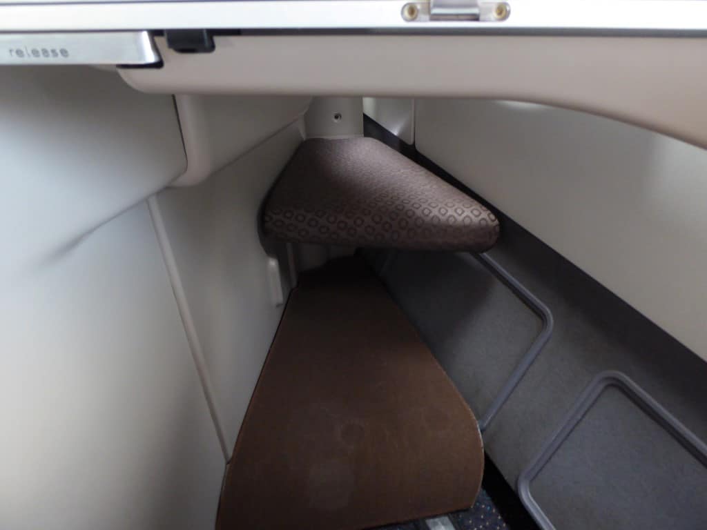 Aan de raamkant van de stoel is nog een klein kastje om wat spullen in op te bergen. Hier is ook een stopcontact, USB plugs en de controller van het In Flight Entertainment Systeem geplaatst.