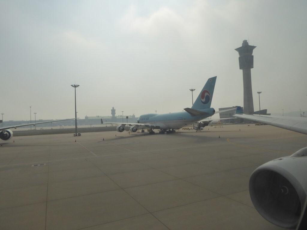 Tijdens het taxiën komen we langs een paar mooie toestellen, zoals deze Boeing 747-400 van Korean Air.