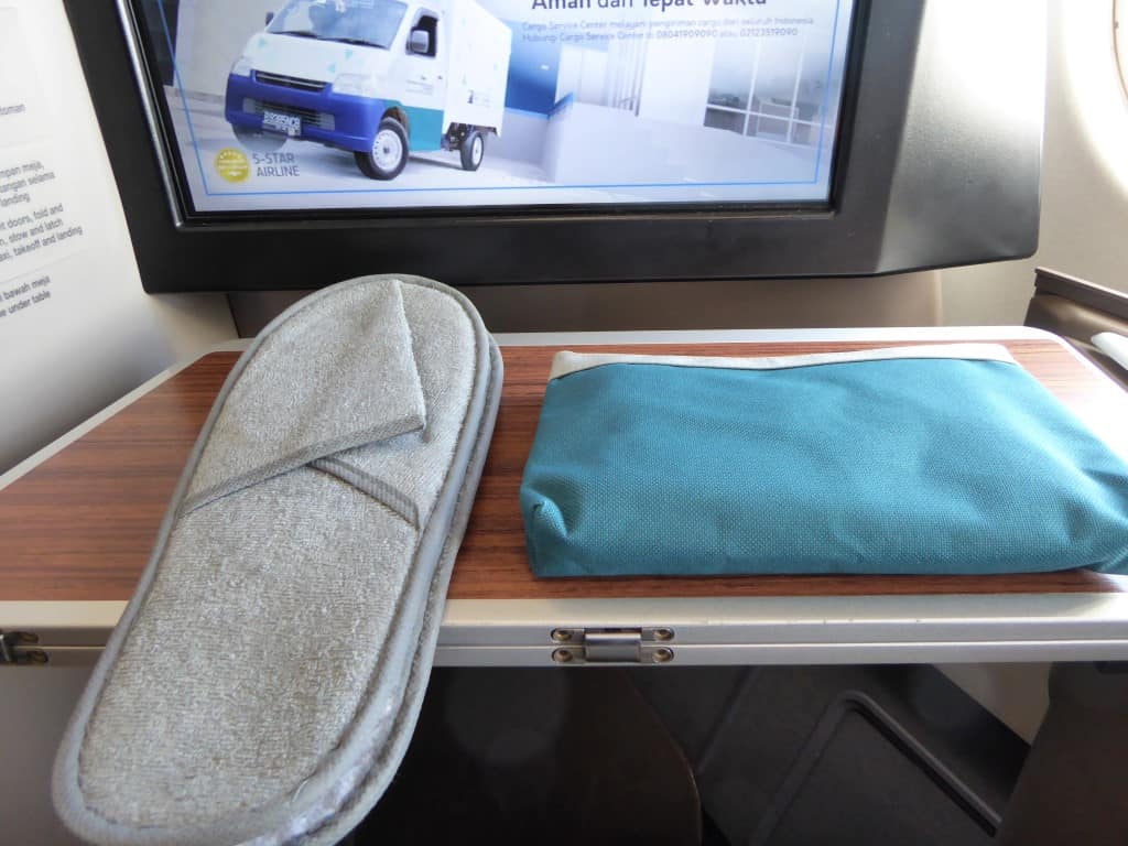 Nadat ik het plaatsgenomen op mijn stoel krijg ik na enige tijd een warm doekje en een welkomstdrankje aangeboden. Garuda Indonesia biedt geen alcohol aan op de grond (althans niet op Incheon) en ik kies dan ook voor een vruchtensap.