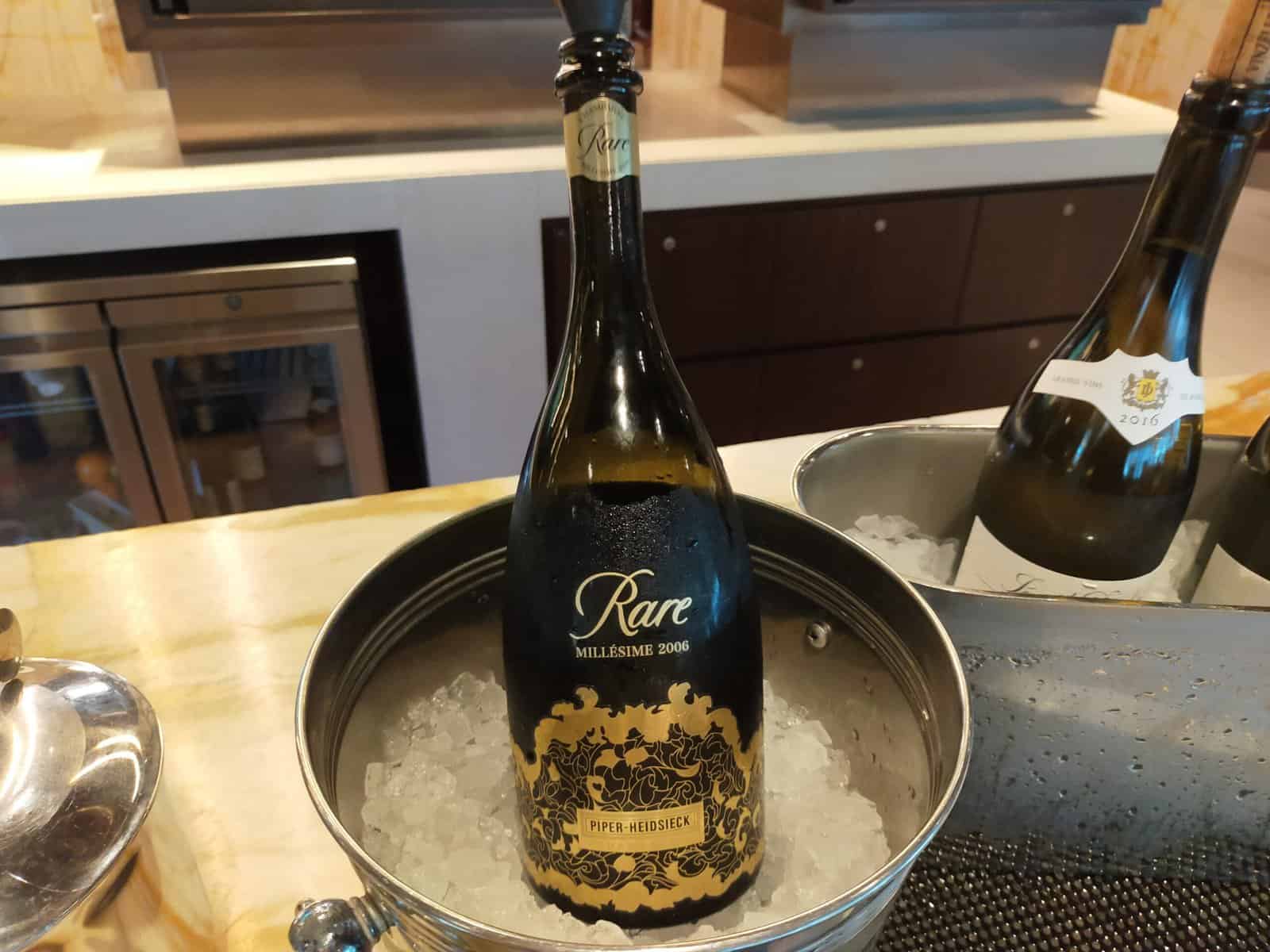 De champagne in de First Class lounge is echter ook niet gek: Piper Heidsieck Rare Millésime 2006. Persoonlijk vind ik deze champagne lekkerder dan de Taittinger. In The Private Room brengen ze je graag de champagne die je wilt hebben en halen ze de fles voor je uit de andere lounge. Geweldige service.
