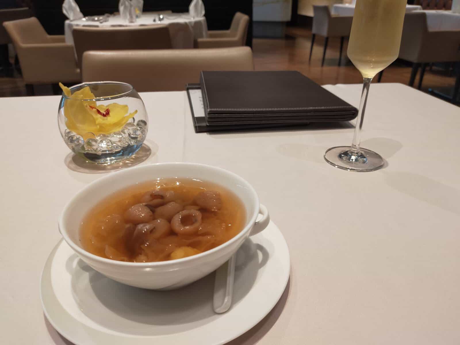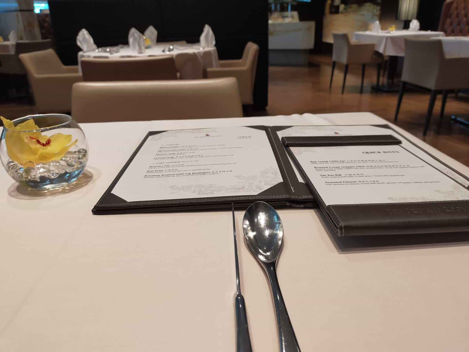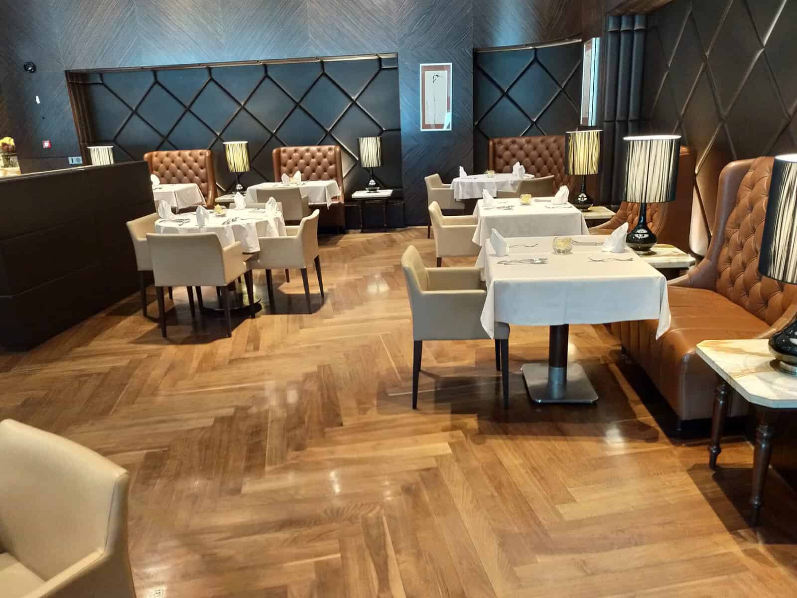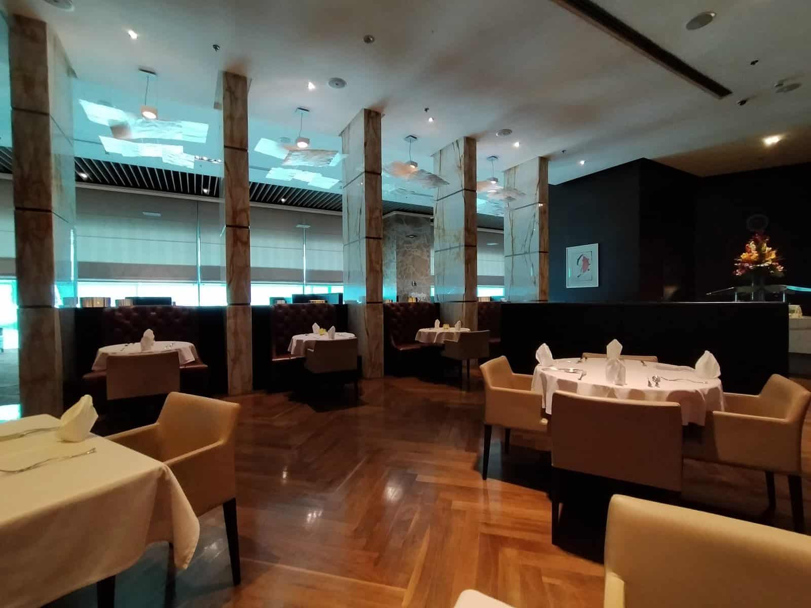 Achterin de lounge is tevens het restaurant te vinden. Je kunt hier duidelijk zien dat het om een First Class lounge gaat, waarbij iedere tafel formeel gedekt is. Zodoende voelt het ook daadwerkelijk als een restaurant aan.