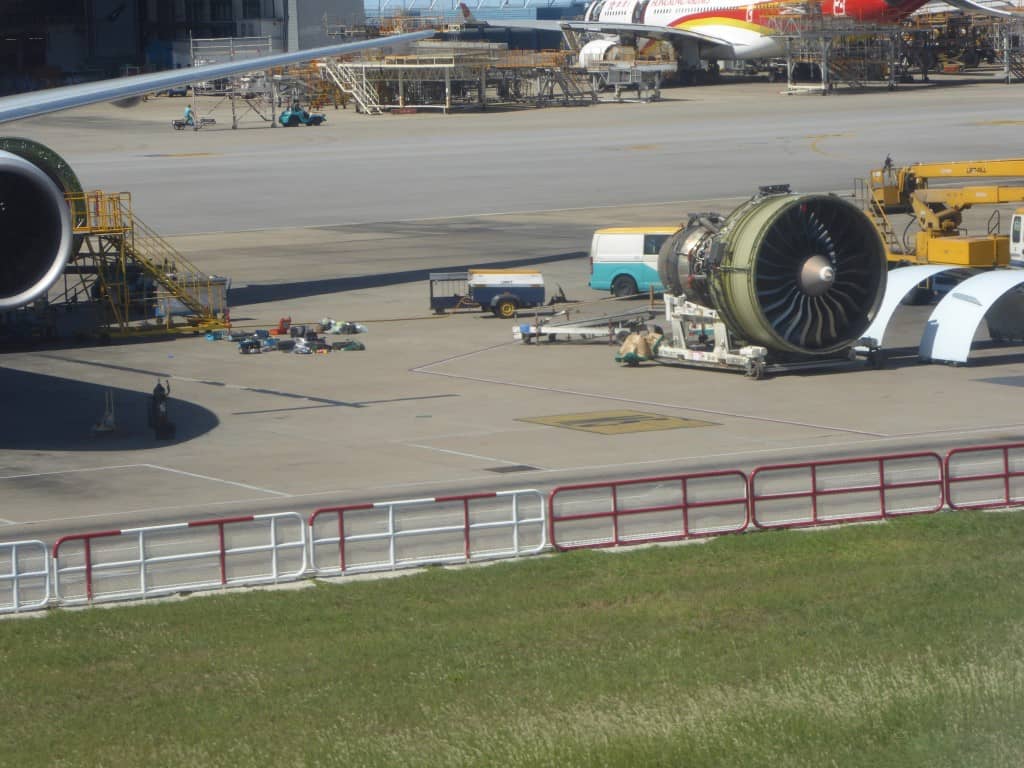 Het leuke aan Hong Kong Airport is dat een gedeelte van het onderhoud gewoon in de open lucht plaatsvindt. Leuk om te zien dat een complete motor uit elkaar ligt te wachten in de buitenlucht.