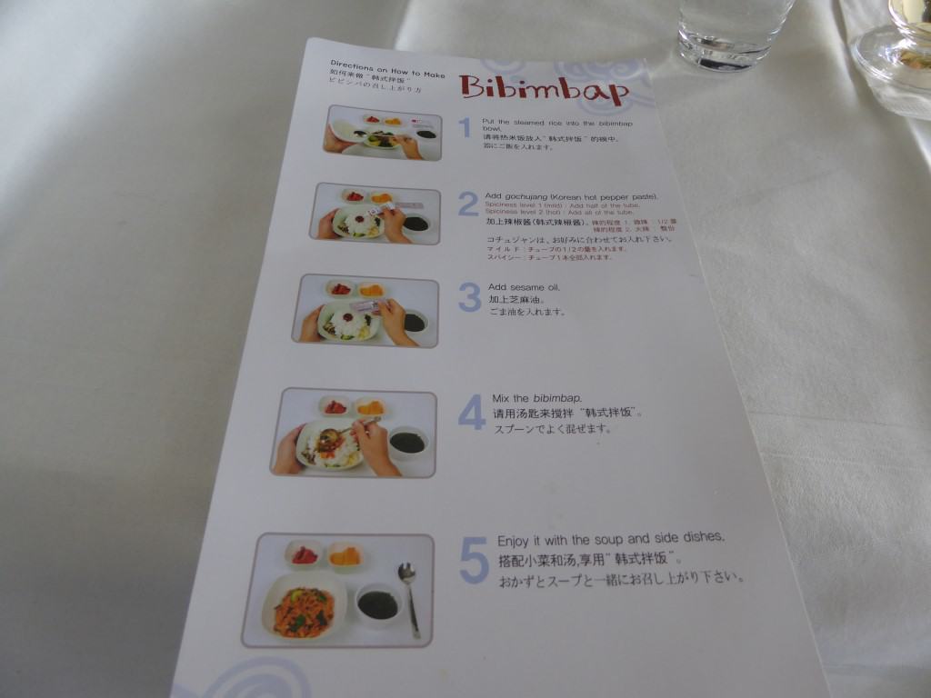 Al vrij snel worden de bestellingen voor het hoofdgerecht opgenomen. De service is dus heel efficiënt. Omdat ik kies voor de Bibimbap vraagt de stewardess of ik weet hoe ik dit moet eten. Omdat ik aangeef dat het “mijn eerste keer” is, krijg ik een gebruiksaanwijzing van haar.