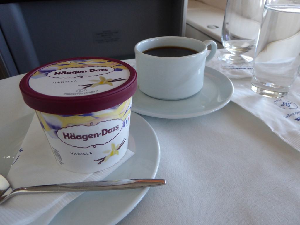 Echt tijd om lekker te dineren heb je niet, want mijn bord Bibimbap is slechts half leeg als de trolley opnieuw voor mijn neus staat: een nagerecht meneer? Nou ja, een Häagen-Dazs ijsje is altijd lekker, dus die bestel ik dan maar. Er volgt ook een kop koffie.